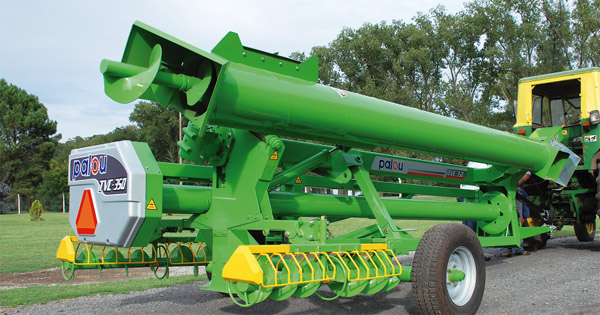 Tubo entero plegable hacia delante para el transporte, sin bancada interna evita obstrucciones y rotura de grano, reduce el desgaste del sinfín y el tubo y el consumo de potencia en forma notable.